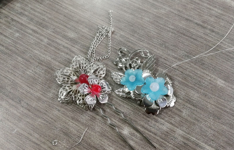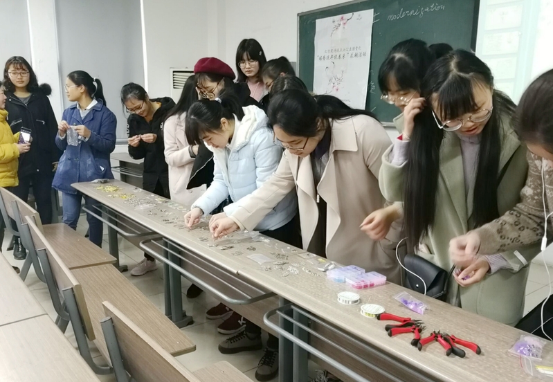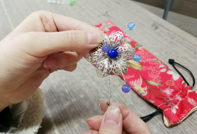 之后是动手环节。同学们首先拿出挑选好的材料,将材料按照脑中构想的画面摆放整理。接着,大家拿出金银铜丝,将各式各样的花片、彩珠缠绕固定在簪子的主体上。志愿者们也时不时走到大家身边,一边提供工具,一边进行技术指导。一开始,同学们的技术颇为生涩,时不时能听到珠石不小心坠地弹跳的声音。渐渐的,大家都得心应手起来,珠宝钳运用熟练,串珠缠丝也动作利落。
