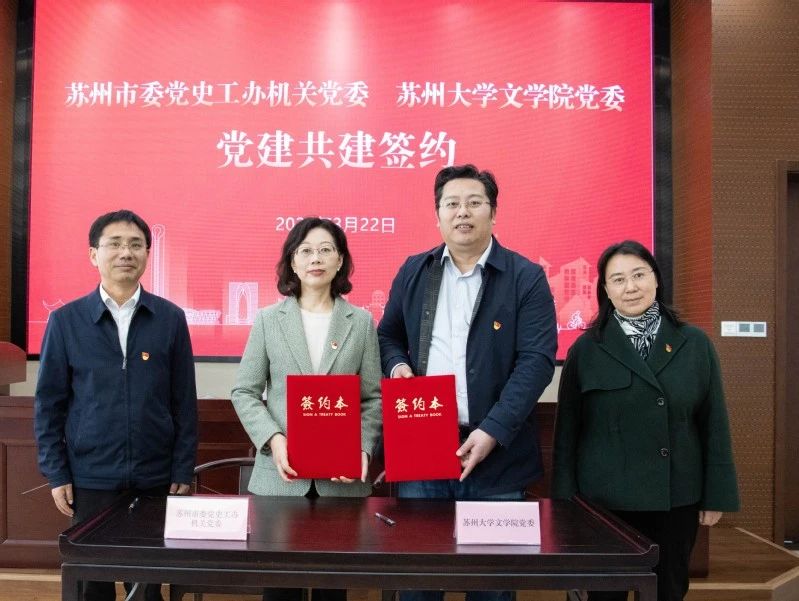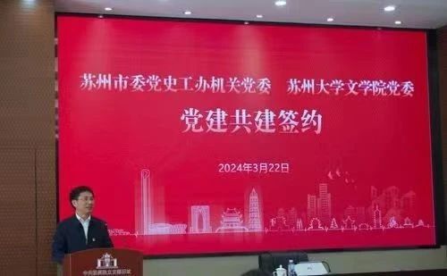 为大力弘扬伟大建党精神,推动党史学习教育常态化、长效化,把握“学思想、强党性、重实践、建新功”的总要求,创新拓展院企地合作新思路、新模式、新方向,建设复合型党史学习基地,深化院地党建协同创新、凝练党建特色品牌、巩固拓展主题教育成果。2024年3月22日,苏州大学文学院党委与苏州市委党史工办机关党委在中共苏州独立支部旧址会议室举行了党建共建签约仪式。