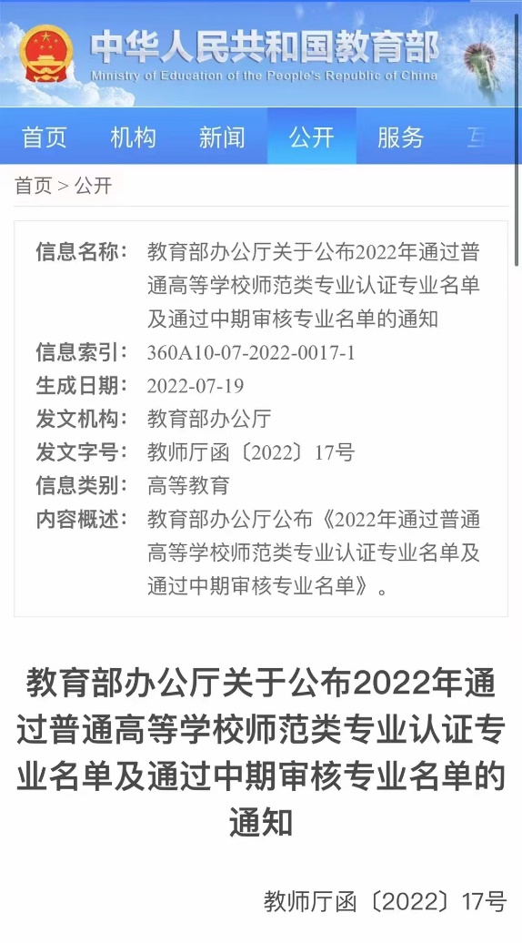 近日,教育部公布了2022年通过普通高等学校师范类专业认证专业名单,我院汉语言文学(师范)专业成功通过了第二级专业认证。汉语言文学(师范)专业在入选2020年度国家级一流本科专业建设点之后,踔厉奋发,砥砺使命,成绩卓著,获了审定委员会专家的一致认可。
