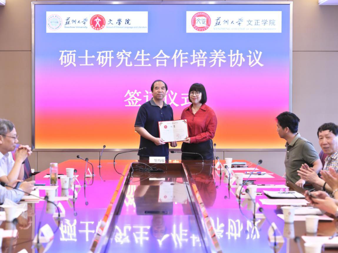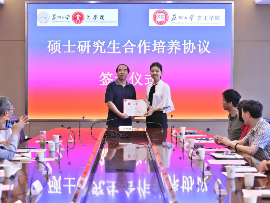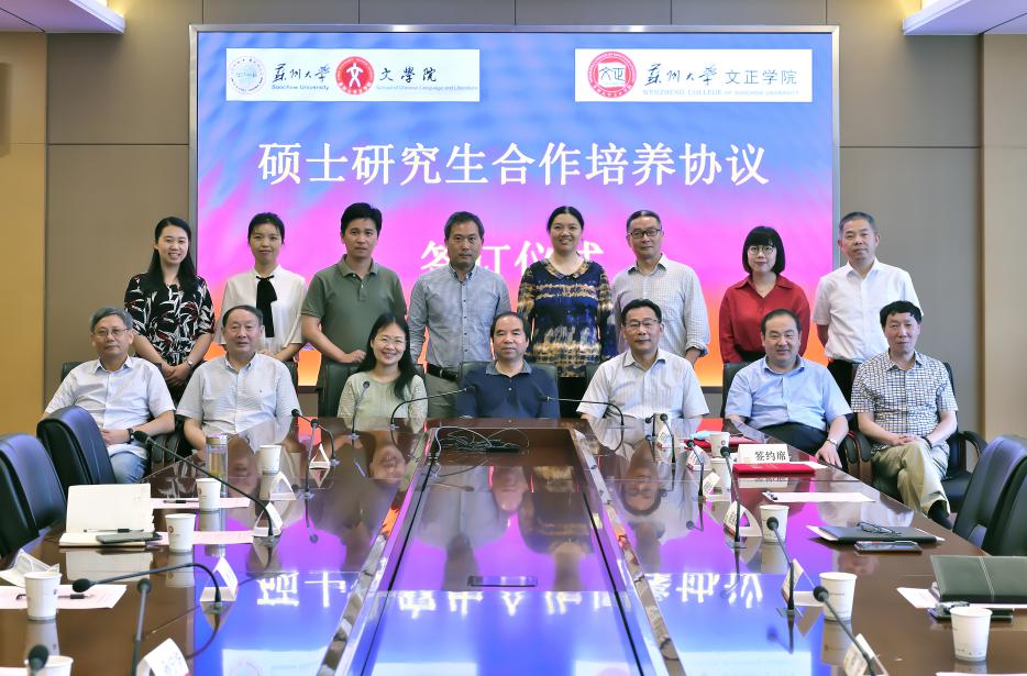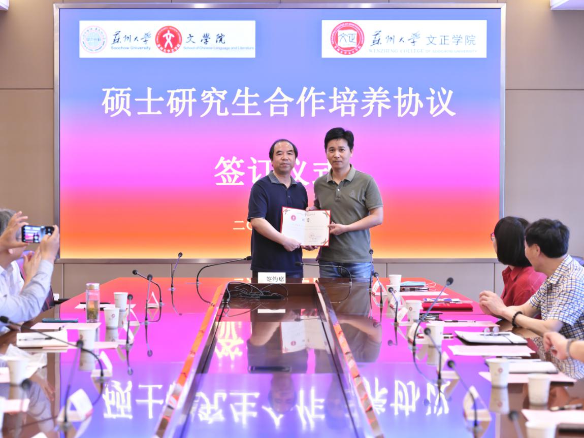 5月29日下午,文学院和文正学院硕士研究生合作培养协议签订仪式在文正学院综合楼三楼大会议室举行。文学院院长曹炜、党委书记孙宁华、副院长周生杰、学科语文专硕领导小组副组长刘祥安教授,院综合办主任赵曜出席会议。文学院院长曹炜、文正学院院长吴昌政分别在协议书上签字盖章。