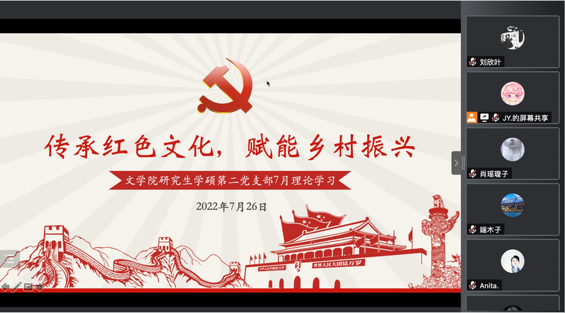 党的十八大以来,习近平总书记高度重视红色基因的传承,他曾在会议上指出,要“用好红色资源,传承好红色基因,把红色江山世世代代传下去。”因此,有效运用红色文化资源,推动乡村中红色教育、红色旅游、红色影视等产业的蓬勃发展,成为带动群众脱贫致富、推动乡村振兴的重要力量。为深入贯彻党中央关于大力弘扬红色文化的决策,以实际行动坚定捍卫“两个确立”,坚决做到“两个维护”,7月26日,文学院研究生学硕第二党支部全体党员以腾讯会议的形式,围绕红色文化与乡村振兴展开了热烈的学习和讨论。
