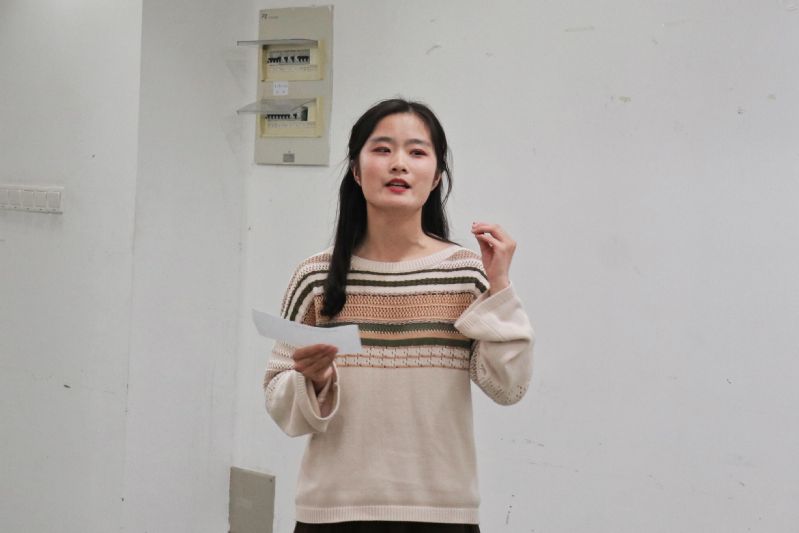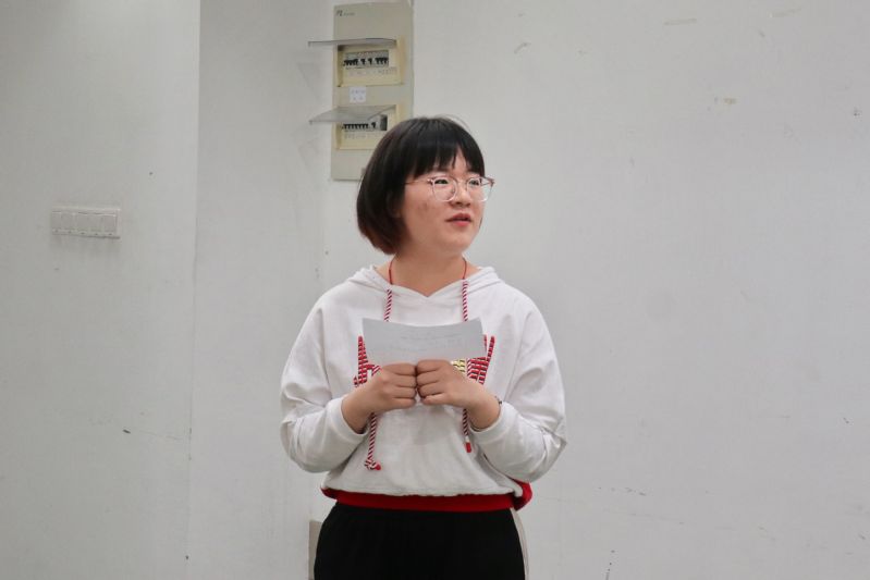 在短暂的游戏环节过后,进入了大赛的第二个环节“咏诗朗文”。文学院的四位选手分别朗读了《你是人间的四月天》、《可以预约的雪》、《如果有来生》、《朱生豪情诗节选》。评委们对他们的台风、表情管理都给予了肯定,同时也指出了他们语速过快的缺点,选手们听后都获益匪浅。