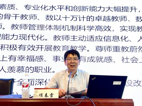 项春雷副局长以“优秀教师的品质”为切入点,从以下四个方面展开演讲。第一是“教师及教师职业特点”,他对教师的内涵进行界定,指出教师职业具备“专业性、发展性、情怀性”三大特点;第二是“教师应该经常反思的问题”,他从哲学、方向、操作三个方面展开论述,强调了职业规划的重要性;第三是“优秀教师的品质”,他指出要想成为一名优秀教师,既要做到“上好课、做好班主任、做好教科研”,还要用“对标总书记要求,善于职业规划,志于不懈追求,勇于不断创新,甘当学校脊梁,丰富专业知识”六条准则自我鞭策;第四是“提升自我魅力的途径”,针对新手教师,他提出了“上好第一堂课,拓展教学内容,遵循师生平等,尊重学生主体和‘备课’亦‘背课’”五点建议。