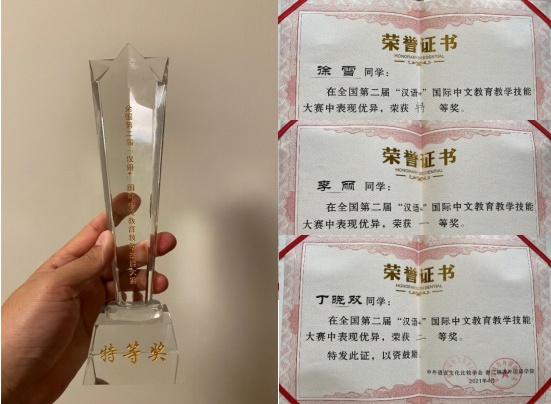 本届国际中文教育教学技能大赛共有来自复旦大学、四川大学、上海交通大学、华东师范大学等50余所高校的硕士生和本科生同台竞技,展开了精彩激烈的角逐。我院参赛选手硕士生徐雪、李丽、本科生丁晓双三位同学不畏强手,顶住压力,在说课、教学和问答等各个环节表现出色,以扎实的教学基本功、新颖的教学设计以及从容的教学风范赢得了专家评委的一致好评,分别荣获特等奖、一等奖和二等奖,充分展现了我校汉语国际教育专业学子的风采。