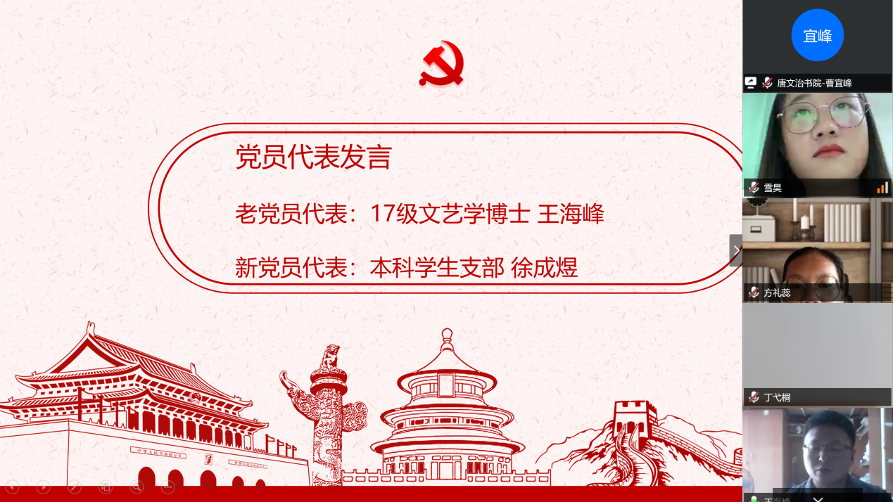 接着,新老党员代表进行了交流发言,老党员代表17级文艺学博士王海峰感谢了母校的栽培,表示将坚定理想信念,不忘初心使命,继续以党员的高标准来要求自己;新党员代表本科学生支部徐成煜结合疫情实际,赞美了疫情期间涌现的先进党员,并表态将进一步履行党员义务,接受党组织的考验。