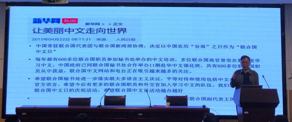 讲座全程,郭教授坚持站着演讲,说到激动处还振手挥舞,使同学们感受到了郭教授对中文事业发展的信心和对同学们的希冀。