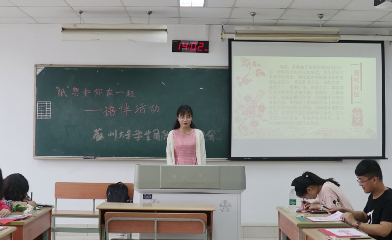 最后,大家拿着自己的刻纸上台展示,互相分享成功的喜悦。在一阵欢声笑语中,“纸”想和你在一起——苏州大学学生交流协会刻纸活动圆满结束了。此次活动不仅使同学们学会了制作刻纸,还提供了一个极好的文化交流的平台,让中外学生一同亲身体验了刻纸文化的趣味。