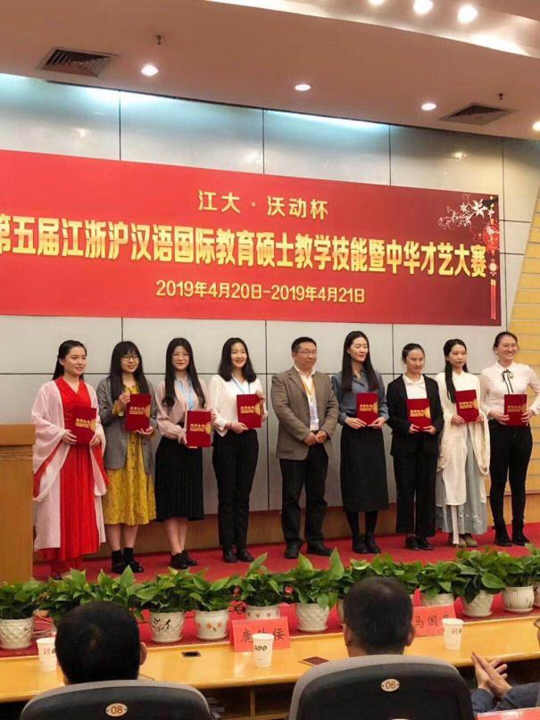 2019年4月20日,由江浙沪汉语国际教育硕士教学联盟主办,江苏大学文学院(语言文化中心)、江苏大学研究生院承办的第五届江浙沪汉语国际教育硕士教学技能暨中华才艺大赛于江苏大学举行,共有来自南京大学、复旦大学、浙江大学、东南大学、上海交通大学、同济大学、南京师范大学、苏州大学等江浙沪的17所高校参加。我院参赛选手柳博芙(俄罗斯)获得教学技能大赛一等奖,王晶晶和于萍萍获得了二等奖,取得了该项赛事创办以来我院选手获得的最佳成绩!