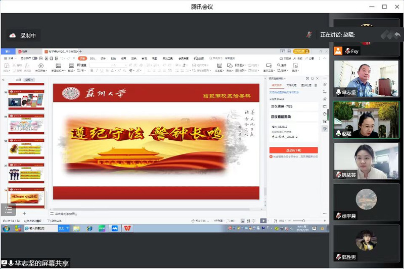 9月20日下午,苏州大学独墅湖校区学生安全知识专题讲座在腾讯会议召开。会议由文学院副院长赵曜主持,苏州大学治安管理科科长芈志坚宣讲,自考秘书姚依芸和自考助学秘书专业全体新生出席了本次会议。