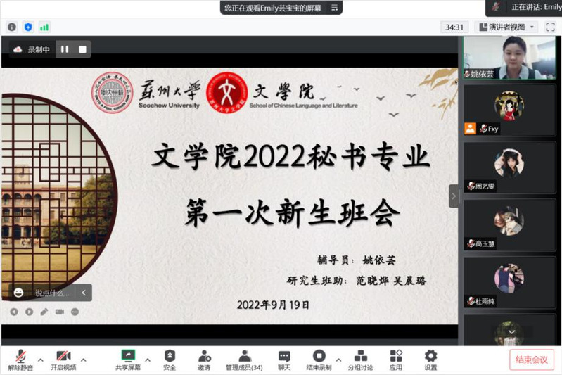 会议初始,姚依芸老师和两位班助依次进行了自我介绍。接着姚老师通过播放短片的形式向同学们介绍了苏州大学的概况,让同学们深深地感受到了苏州大学的魅力和浓厚的学习氛围。接下来姚老师为同学们介绍了苏州大学的规章与制度,包括自考课程安排,成绩与考试、学生守则以及疫情管理等方面的内容。随后姚老师为同学们介绍了苏州大学独墅湖校区的食、住、行,引导新生适应大学生活。最后进行了班委的竞选演讲,同学们踊跃参与,纷纷表示想要为班级做出自己的贡献。