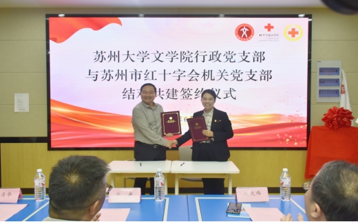 苏州大学文学院副院长、行政党支部书记赵曜与苏州市红十字会党组成员、副会长张根生现场签订了支部党建结对共建协议书,为共建各方提供了互学互鉴、互促互进的平台。