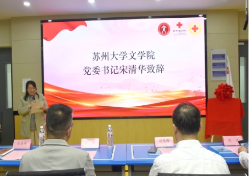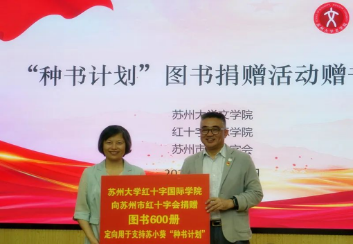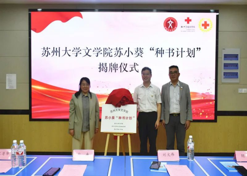 苏州大学文学院党委书记宋清华、红十字国际学院常务副院长郑庚,苏州市红十字会党组书记、常务副会长刘文伟共同为苏州大学文学院苏小葵“种书计划”揭牌。