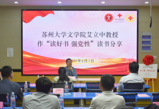现场进行了党建联学共建活动。苏州大学文学院党委委员艾立中教授为大家带来“读好书 强党性”读书分享。艾教授以《红星照耀中国》《红岩》为例,分享了自己的读书经历,鼓励大家都要多读书、读好书,尤其要多亲近理论原著,进行整本书阅读,含英咀华,在阅读中增强党性修养。