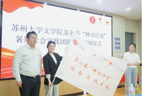 苏州大学文学院党委副书记阴浩为“苏小葵‘种书计划’”社会实践活动授旗,希望苏小葵“种书计划”能够在苏州大学文学院、红十字国际学院、苏州市红十字会三家单位的支持下,不忘共享书香初心,真切以阅读文化赋能留守儿童,擦亮志愿服务的青春底色。