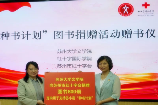 苏州大学文学院党委书记宋清华、红十字国际学院常务副院长郑庚代表文学院、红十字国际学院各捐赠图书600册,苏州市红十字会党组成员、秘书长马红英代为接收。