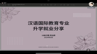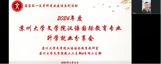 为持续巩固苏州大学文学院国家级一流本科专业建设成果、增强专业学生升学就业规划意识、提高专业学生综合素质与能力、助力文学院优良学风建设,2024年6月16日晚18:00,由苏州大学文学院汉语国际教育教研室、苏州大学文学院教工第二党支部、苏州大学文学院专硕第二党支部联合举办的“国家级一流本科专业建设系列活动——2024年度苏州大学文学院汉语国际教育专业升学就业分享会”顺利展开,来自苏州大学文学院汉语国际教育专业的本科生、研究生、毕业生齐聚腾讯会议,就升学、就业等与学生未来发展规划息息相关的问题进行交流、讨论。本次会议由苏州大学文学院专硕第二党支部书记乔丹同学主持。