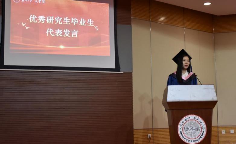接着,优秀研究生代表傅蓉同学发言。傅蓉同学代表文学院2024届全体毕业生对师长们表达感谢。一朝沐杏雨,一生念师恩;怀念过往,展望未来,她回忆了在苏州大学就读的7年学生生涯,她始终遵循苏大校训“养天地正气,法古今完人”,不负韶华、砥砺前行。傅蓉同学祝愿同学们在今后,继续铭记校训教诲,梦想常青,担当常在,无愧于新时代!