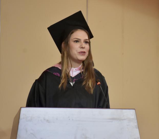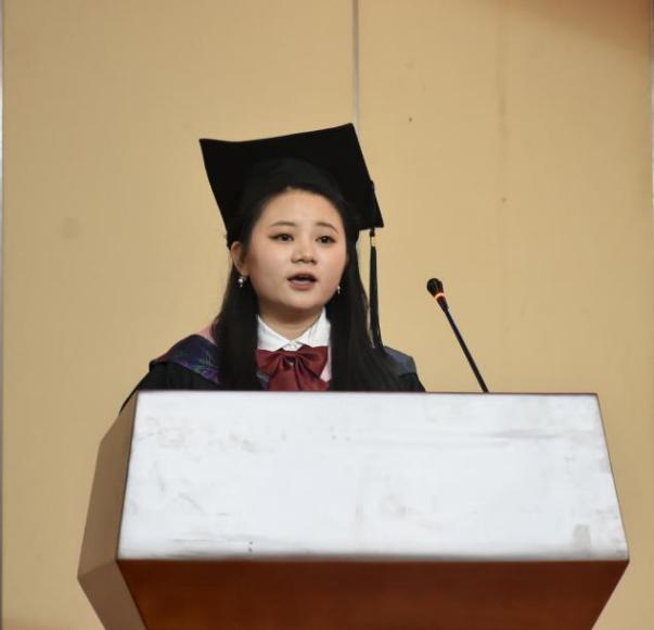 优秀留学生代表马一诺发言。马一诺同学来自波黑,是文学院汉语言文学专业的本科生。四年前,她心怀对中国文化的憧憬,跨越万水千山,来到梦寐以求的苏州大学文学院。她感谢苏州大学给全体留学生搭建的宝贵平台,在冬至包饺子、端午赛龙舟等丰富多彩的课外活动中亲身体验中国文化的魅力。她代表全体留学生毕业生,希望能将自己在苏州大学文学院学到的宝贵知识和经验教诲带回自己的祖国,为促进两国文化交流和国际友谊作出贡献。