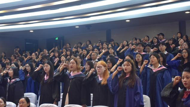 师生代表发言结束之后,在毕业生代表赵钰晗同学的领誓下,全体毕业生庄严宣誓,未来会主动承载东吴精神,担负时代使命;情系母校,养天地正气,法古今完人,奋力书写青春篇章!