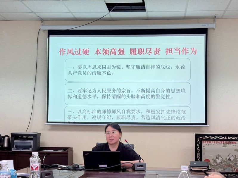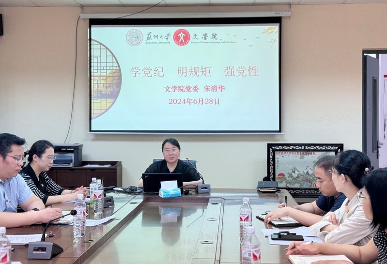 2024年6月28日上午,文学院行政党支部于5335会议室组织党纪学习教育集中学习,文学院党委书记宋清华作“学党纪、明规矩、强党性”专题党课辅导,文学院全体行政人员参加了学习,活动由支部书记、文学院行政副院长赵曜主持。