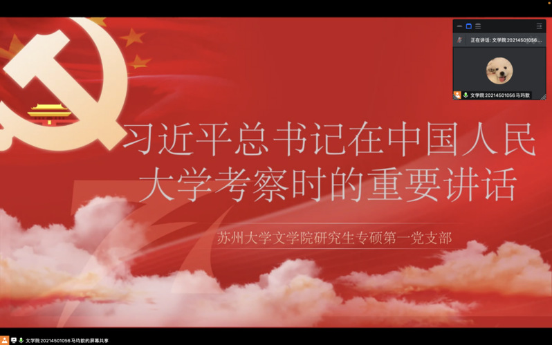 2022年5月23日下午4点30分,苏州大学文学院研究生专硕第一党支部在线上展开了“继承优良传统,赓续红色血脉”五月理论学习暨主题党日活动。活动由党支部书记马玙歆同志主持,支部全体党员参与。