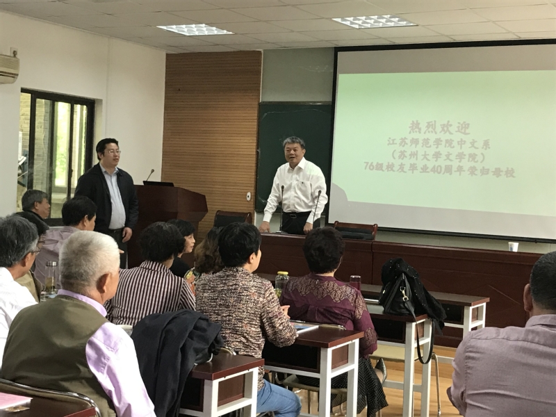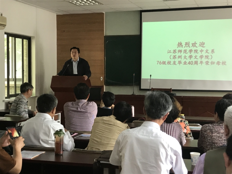 接着,文学院党委副书记阴浩发言。阴书记代表苏州大学文学院向30位76级中文系校友们表达了热烈的欢迎,并向校友们介绍了苏州大学的发展情况,重点介绍了苏州大学文学院目前的学科设置、发展情况以及近年来取得的成就。校友们得知母校四十年的巨大变化发展都很兴奋,为母校取得的成绩而骄傲。