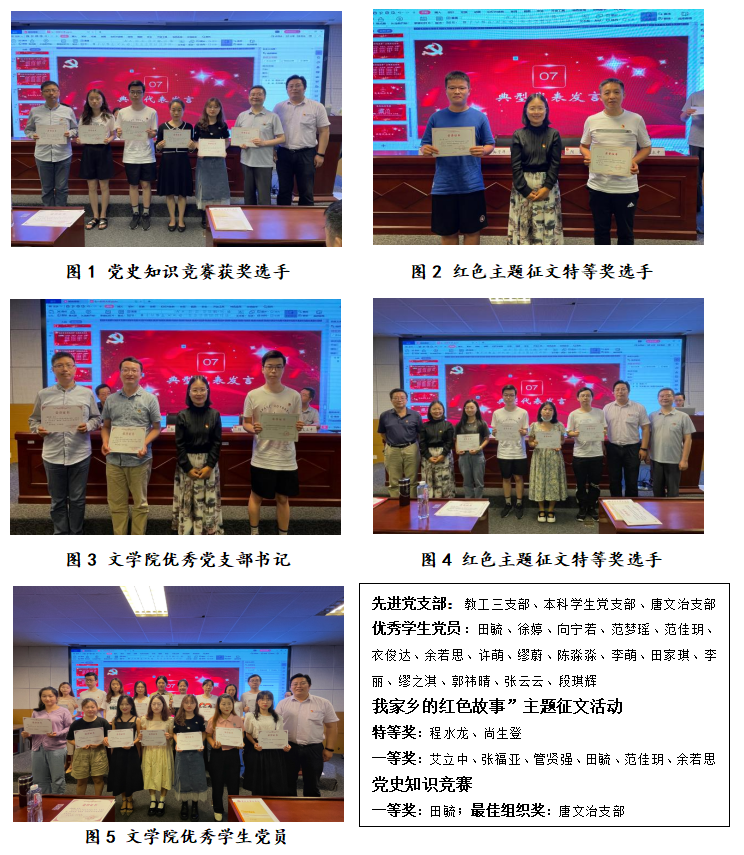 在党史学习教育期间,我院党委在配合学校完成一系列规定动作的同时,组织了丰富多彩的活动,诸如“讲述我家乡的红色故事”征文比赛、党史知识竞赛等。广大师生党员参与热情高涨,获得了可喜成绩。接下来,党委副书记阴浩向与会人员宣读各类活动的获奖名单,随之与党委书记孙宁华、党委委员王建军与艾立中一同向获奖同志颁发证书,并合影留念。