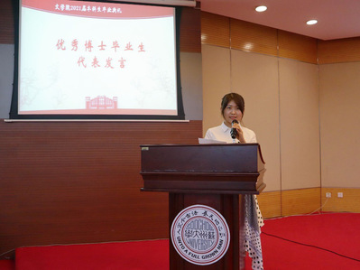 2021届优秀博士研究生代表李璐上台发言。她回忆了在苏州大学度过的九年时光,对自己的导师曹炜教授以及师姐、师妹们表达了真挚的感恩,并希望同学们都能保持强健的体魄,勉励同学们无论是读书还是工作,都要保持诚恳与谦逊。接着,优秀本科毕业生代表缪蔚上台发言,她分享了自己对四年大学生活的美好回忆,对辛勤付出的领导、老师、室友和所有帮助过自己的朋友表示了衷心的感谢,诉说了对母校的万般不舍与留恋。