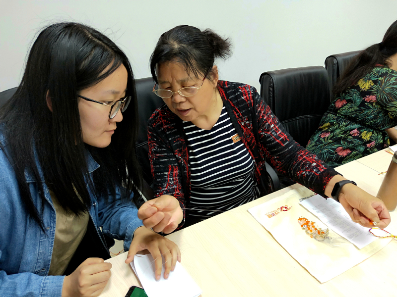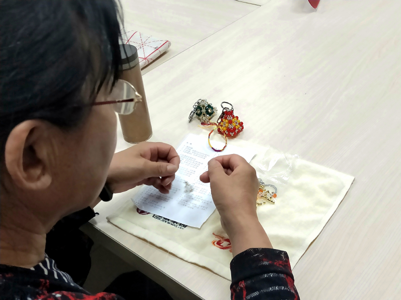 最后进入到彩绳编粽子环节。社区负责人为家长们和志愿者们分发了材料包,接着便由手艺纯熟的阿姨们带着不熟练的家长和志愿者们开始粽子的编织。在阿姨们认真耐心地讲解与帮助下,家长与志愿者们学会了回穿法、藏结收紧等方法,对立体双色粽子编织口诀也能无阻碍理解后,家长与志愿者们渐入佳境,埋头仔细编织。阿姨们不时地帮助解决编织中遇到的问题,指出其中的错误。在活动结束时,她们还不愿停下,阿姨们安慰道掌握了技巧,回去慢慢编织也可以。大家互相欣赏着自己的作品,非常喜悦。至此,本次传统文化公益课堂活动落下帷幕。