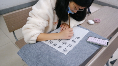 随后,工作人员们分发硬笔与软笔书写工具,同学们围绕主题开始创作书法作品。有的同学奋笔疾书,文思泉涌;有的同学提笔沉思,思虑良久。同学们的作品紧扣主题,字体风格多样,字迹工整美观,或清秀娟丽,或豪气磅礴,或古韵古香。现场创作热情高涨,气氛火热。