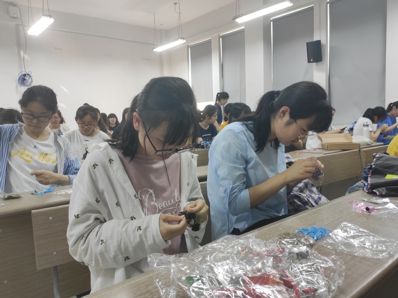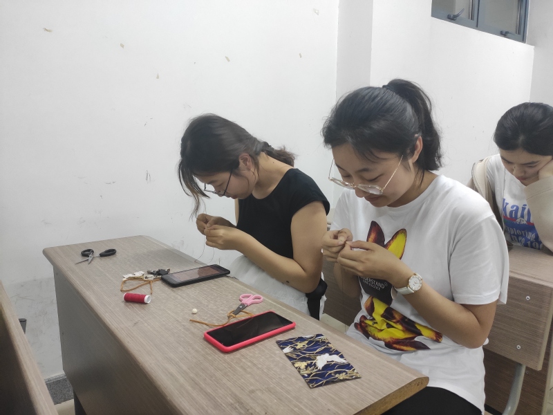 听了宋同学的讲解,同学们都跃跃欲试。现场气氛也立刻活跃了起来。同学们穿针引线,在优美的古琴声下,专心致志地进行缝制工作,别有一番情趣。当然,同学们也遇到了各种各样的状况,比如针扎破了手,缝合不密导致漏洞,牛皮绳穿不进珠子等等,但在同学们的互相帮助下,问题都迎刃而解,现场一片欢声笑语。